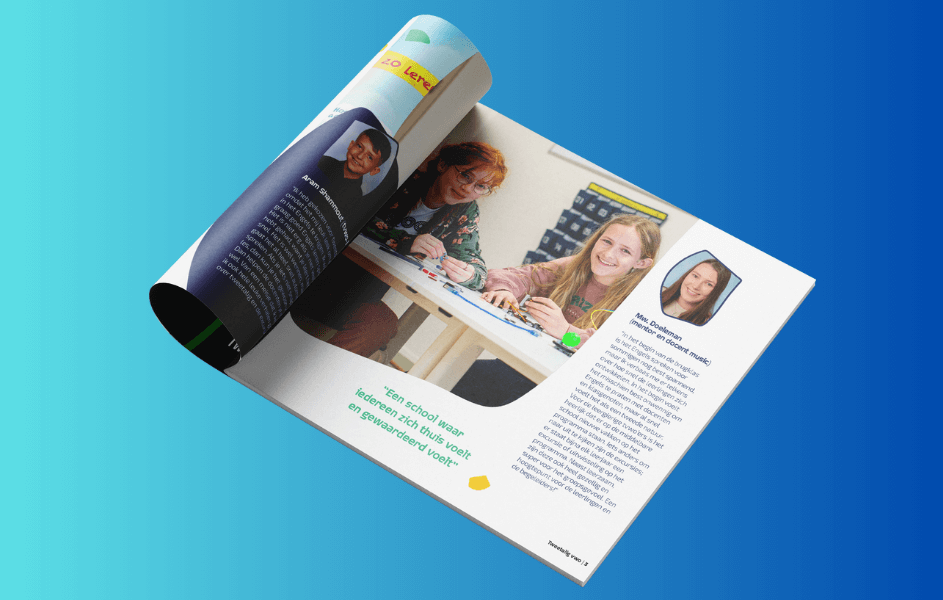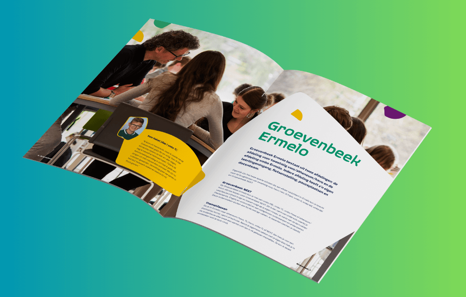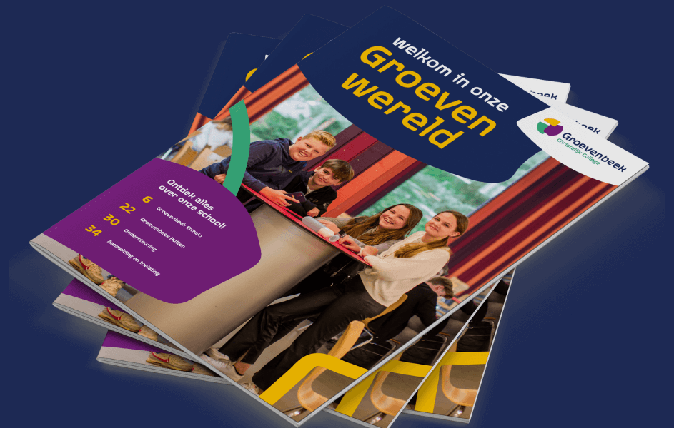 Voor Christelijk College Groevenbeek ontwierpen we het magazine ‘Welkom in onze Groevenwereld’, dat opgezet is om nieuwe leerlingen wegwijs te maken op de school. We ontwierpen het magazine in de huisstijl van het college.