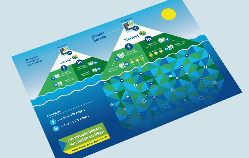 We ontwierpen een infographic voor VierTaal, die de visuele impact van delen en liken op social media inzichtelijk maakt. De infographic is opgemaakt in de huisstijl van VierTaal en geeft eenvoudig weer hoe je meer bereik kunt krijgen.