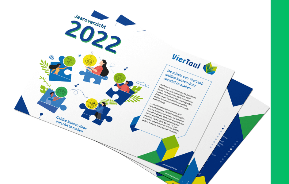 Stichting VierTaal vroeg ons om een passend ontwerp te maken bij hun jaarverslag over 2021. We creëerden een kleurrijk en overzichtelijk document in de huisstijl van VierTaal, waarmee de stichting een aantrekkelijk en informatief jaaroverzicht van de eigen activiteiten en prestaties kan tonen.