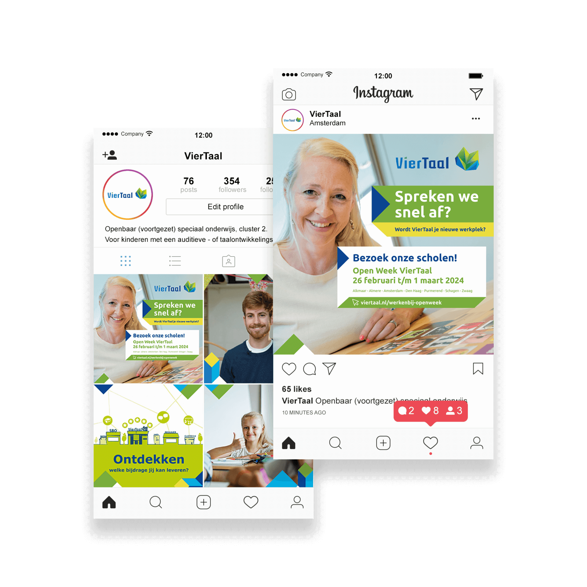 We verzorgden de content (tekst en beeld) voor de social media-posts die we vervolgens plaatsten voor Stichting VierTaal. De social media-campagne vertelt het verhaal van diverse nieuwe leerkrachten bij VierTaal en laat zien hoe het onderwijs werkt voor slechthorende leerlingen en/of leerlingen met een taalontwikkelingsstoornis (TOS). Doel van deze campagne is dat we leraren kennis laten maken met VierTaal en hopen dat ze uiteindelijk solliciteren bij VierTaal. Deze campagne wordt gevoerd in verschillende fasen (see-think-do).